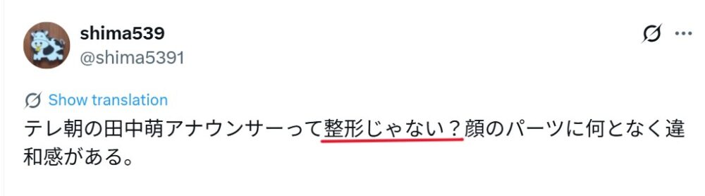 SNS上でも田中萌アナの整形を疑う声も上がっているようですね。